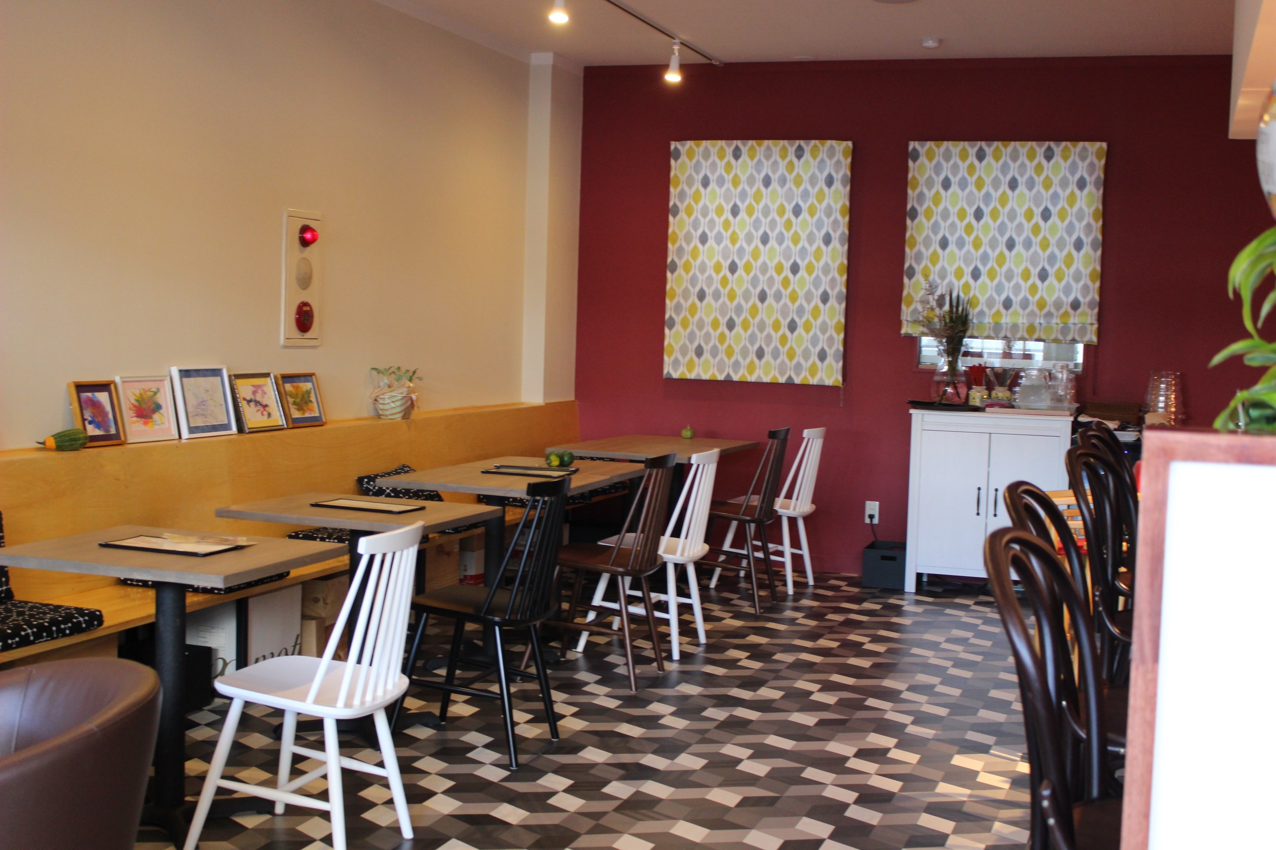 カラフルでな壁紙やほのかな明かりを落とした半個室やカジュアルなカフェスタイルのテーブル席、パソコンを使いながらゆったりと通りを眺められる窓際のカウンター席など、さまざまな用途で使えるように工夫をこらされています。
