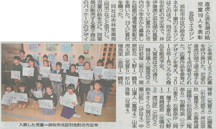 2017年11月15日(水)静岡新聞朝刊地域西欄に「直虎と浜名湖の絵 児童19人を表彰」の見出しで記事の掲載がありました。