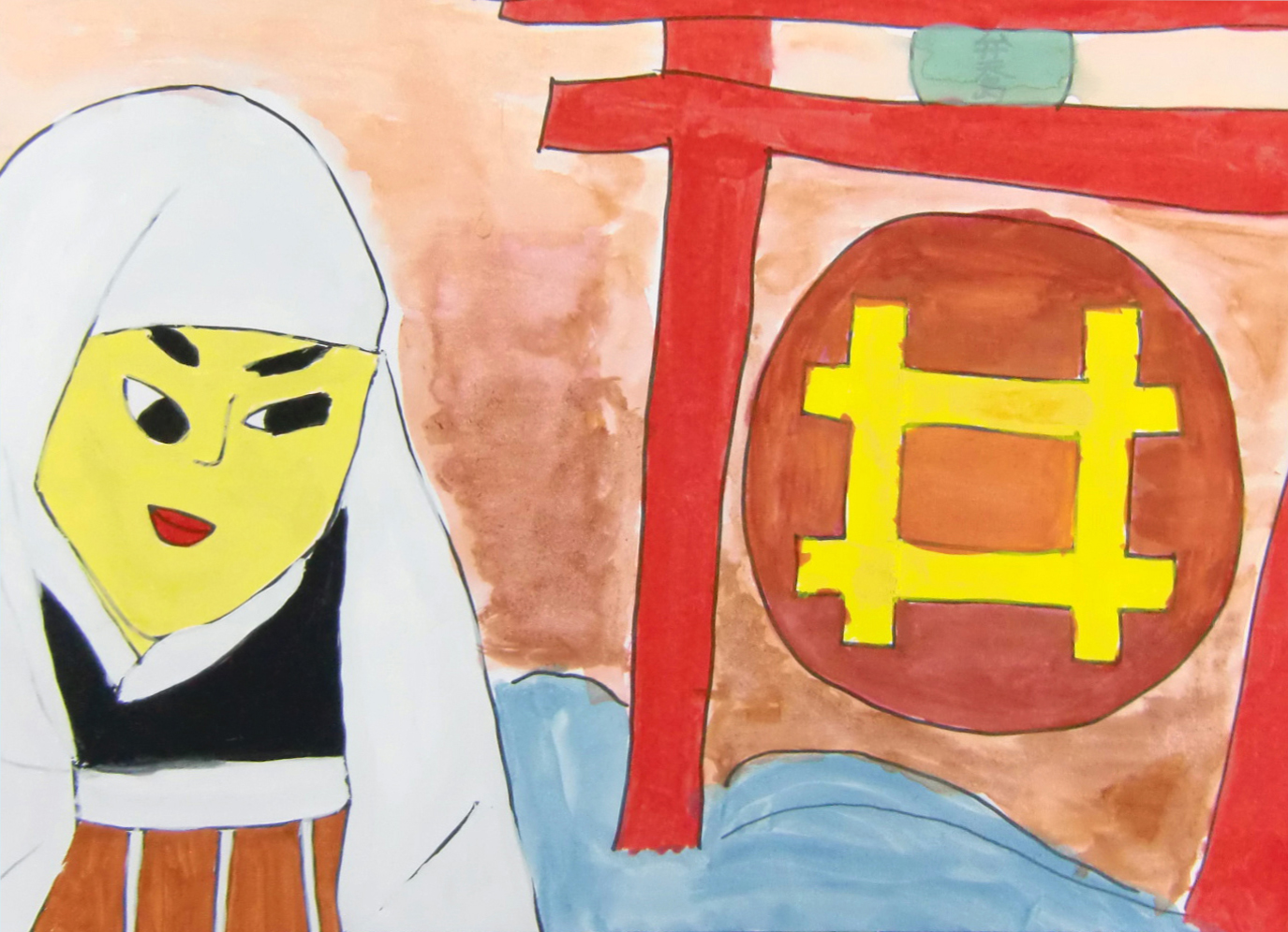 作品コメント:弁天に夕陽が差しかかった情景に直虎を重ねました。弁天の鳥居の中の夕陽に井伊の家紋を描きました。