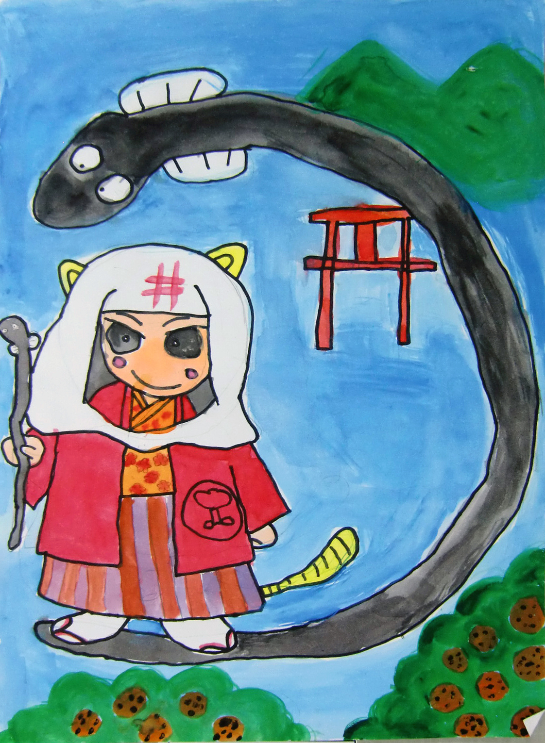 作品コメント:直虎がうなぎでサーフィンにのって浜名湖をさんぽしたよ。うなぎが浜名湖のかたちに見えるでしょ。
