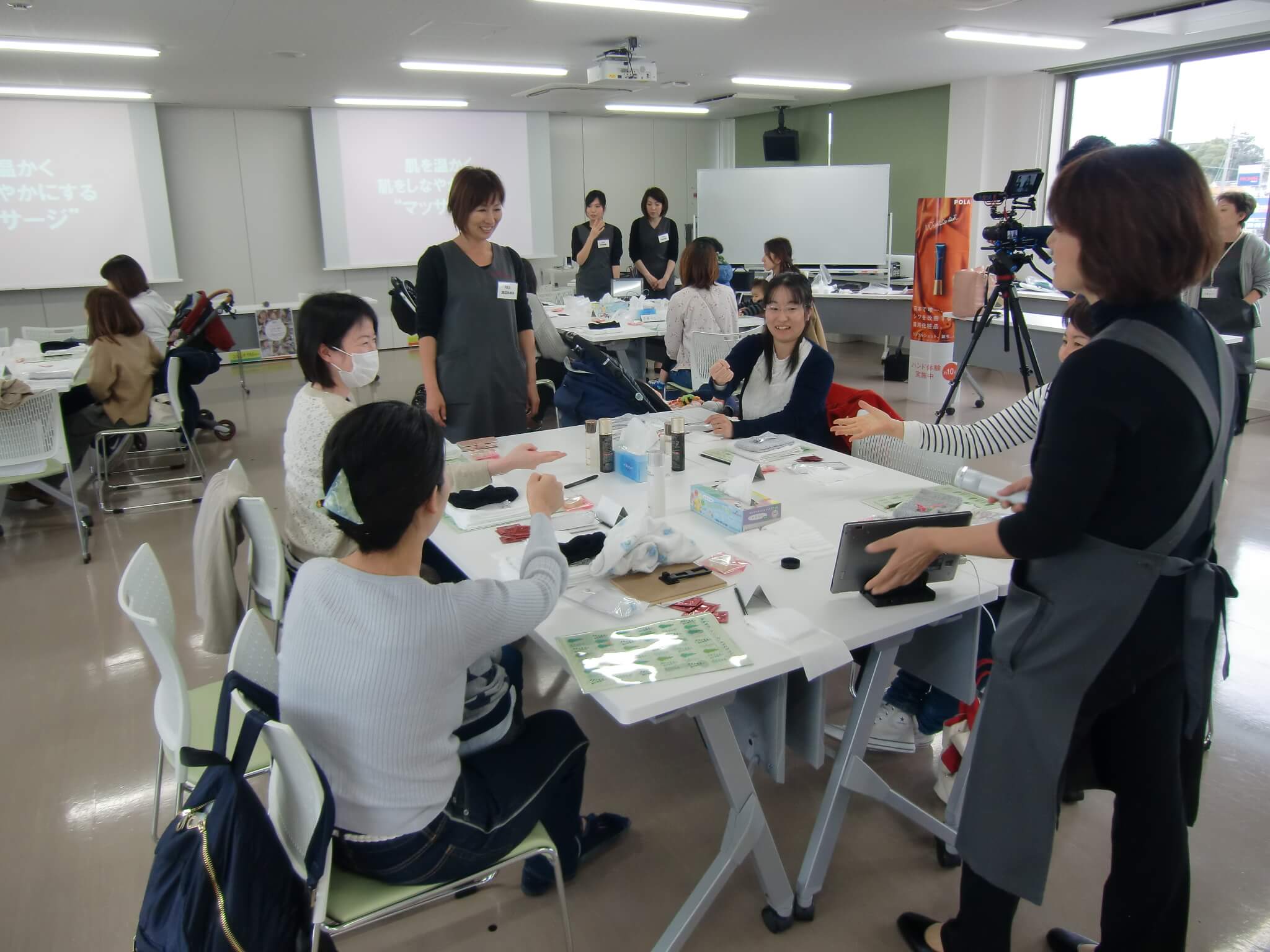 今回は、化粧ノリをよくするため肌を温かく、しなやかにするためのマッサージを行いました。