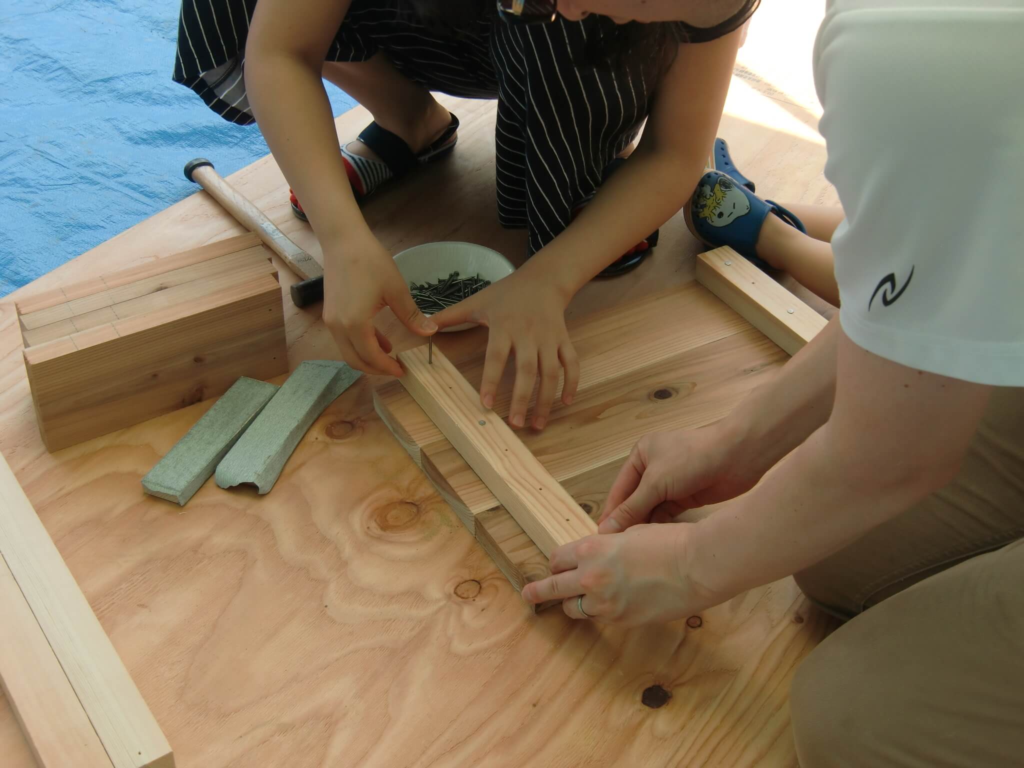 金槌を持つとワクワクします。息子も金槌に興味津々!息子に金槌を奪われ、それを取り返し、を繰り返しながら一緒に(?)作業を進めました。