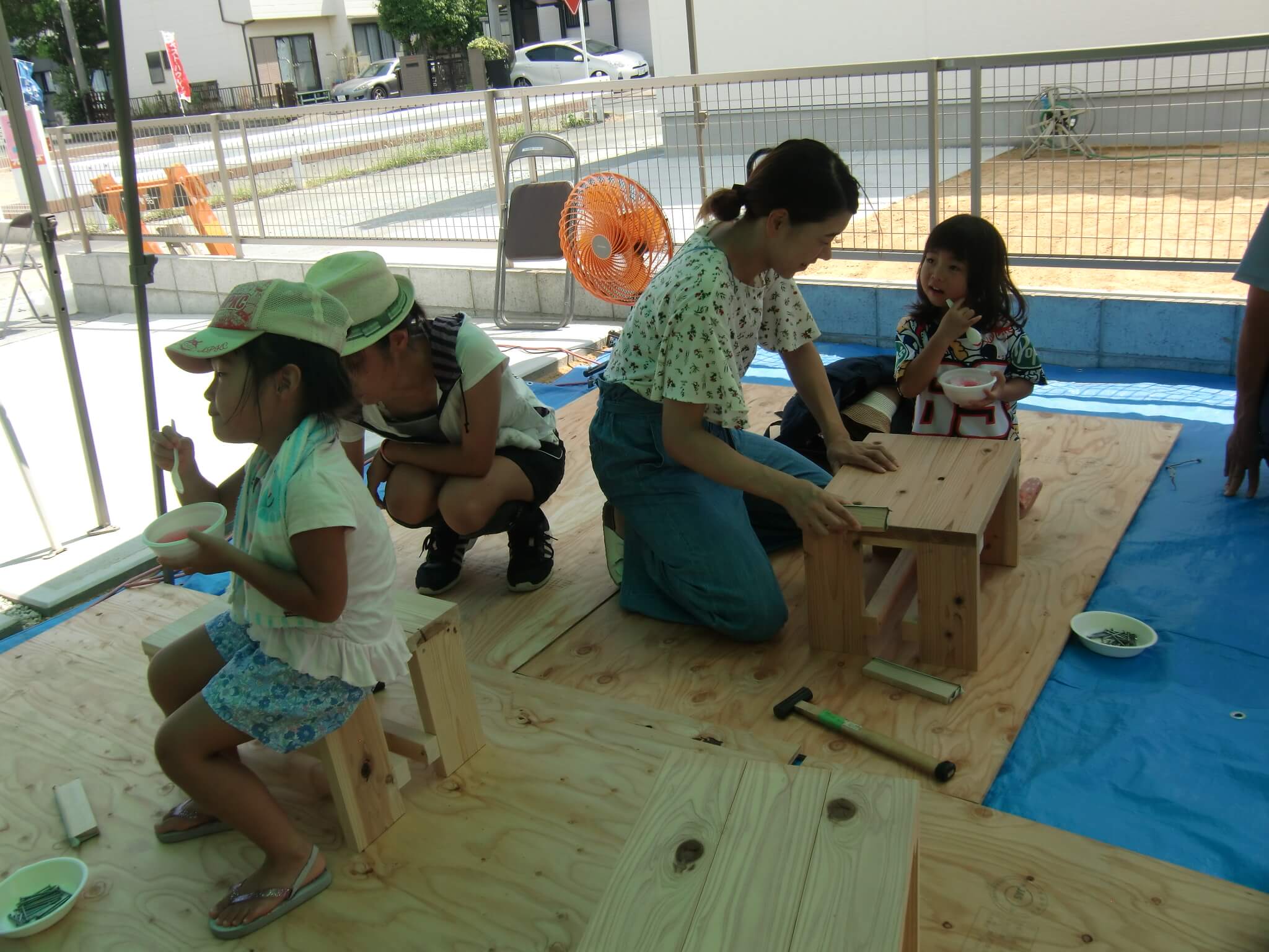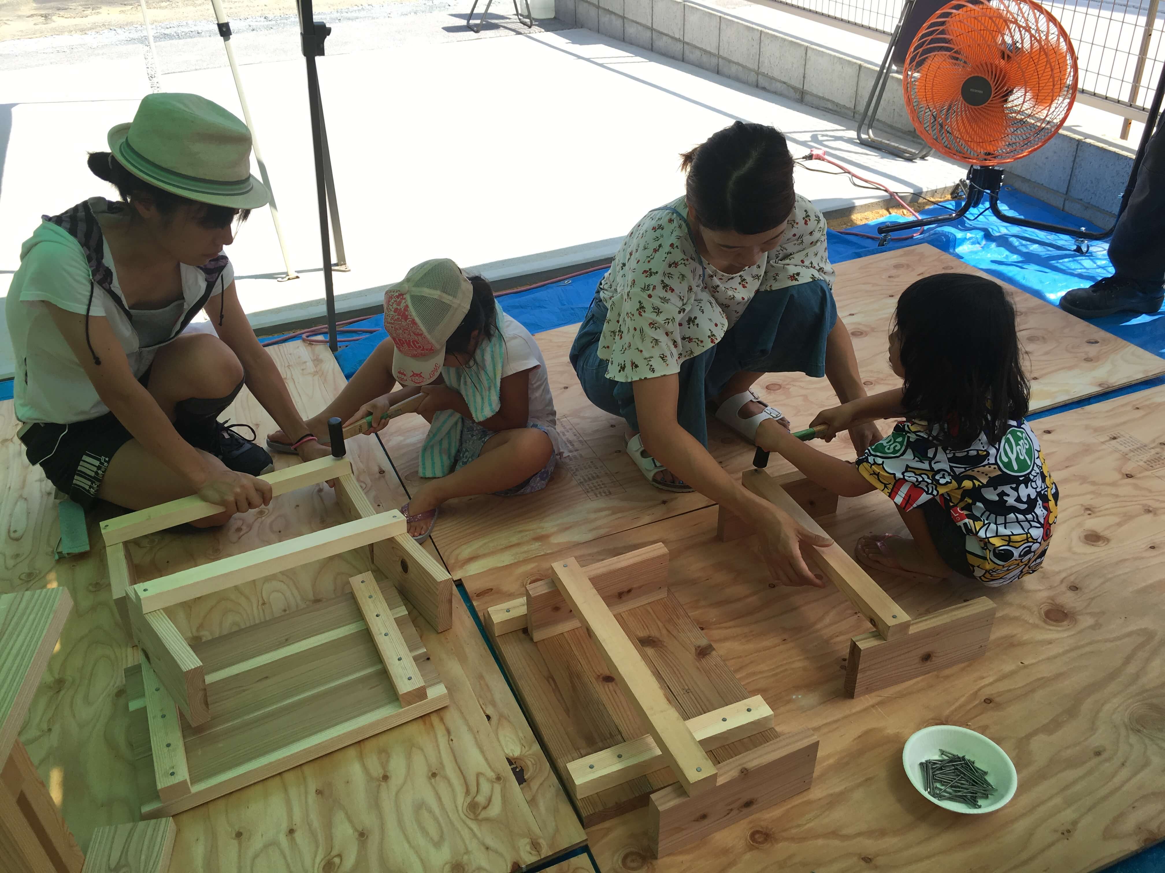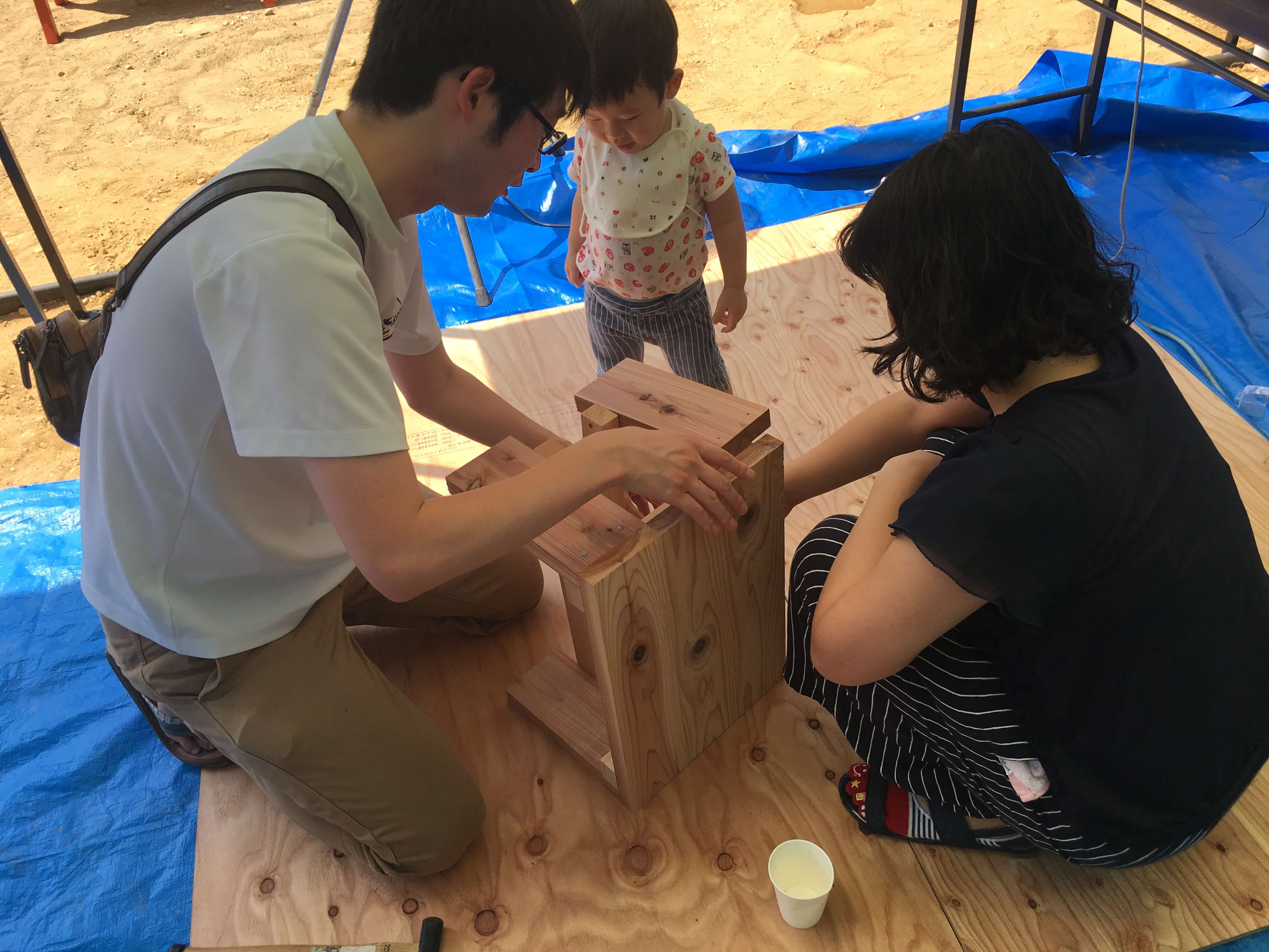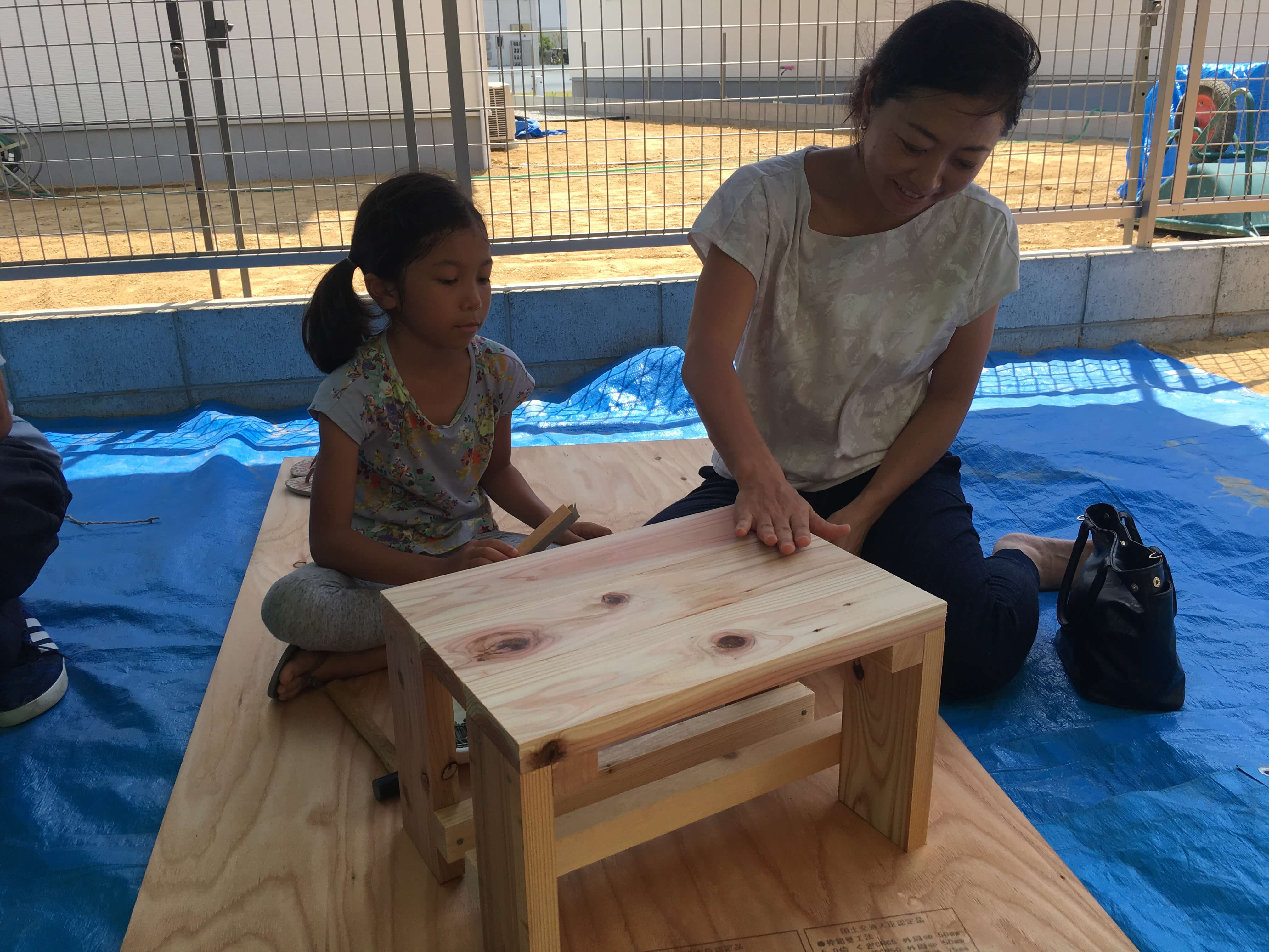 家に帰って、早速作ったテーブルの上で、積み木を積んで遊びました。木の香り、手触りが落ち着きます。このテーブル、お母さんが作ったんだよと言えるのがいいですね。