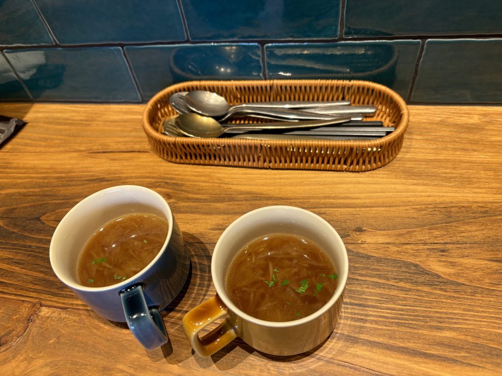 カップまで愛おしいデザイン: ブルーやマスタードイエローなど、色違いのマグカップで提供されるのも遊び心があって素敵ですよね。手に馴染む温かみのあるカップが、お料理の「手作り感」をより引き立ててくれます。心ほどける「最初の一杯」熱々のスープをゆっくり味わう時間は、忙しい日常をふっと忘れさせてくれるプロローグ。この一杯があるからこそ、その後に続くメインプレートへの期待がさらに膨らみます。「店内の鮮やかなブルーのタイルを背景に撮ると、スープがより美味しそうに見えて、ついついシャッターを切ってしまいました。」