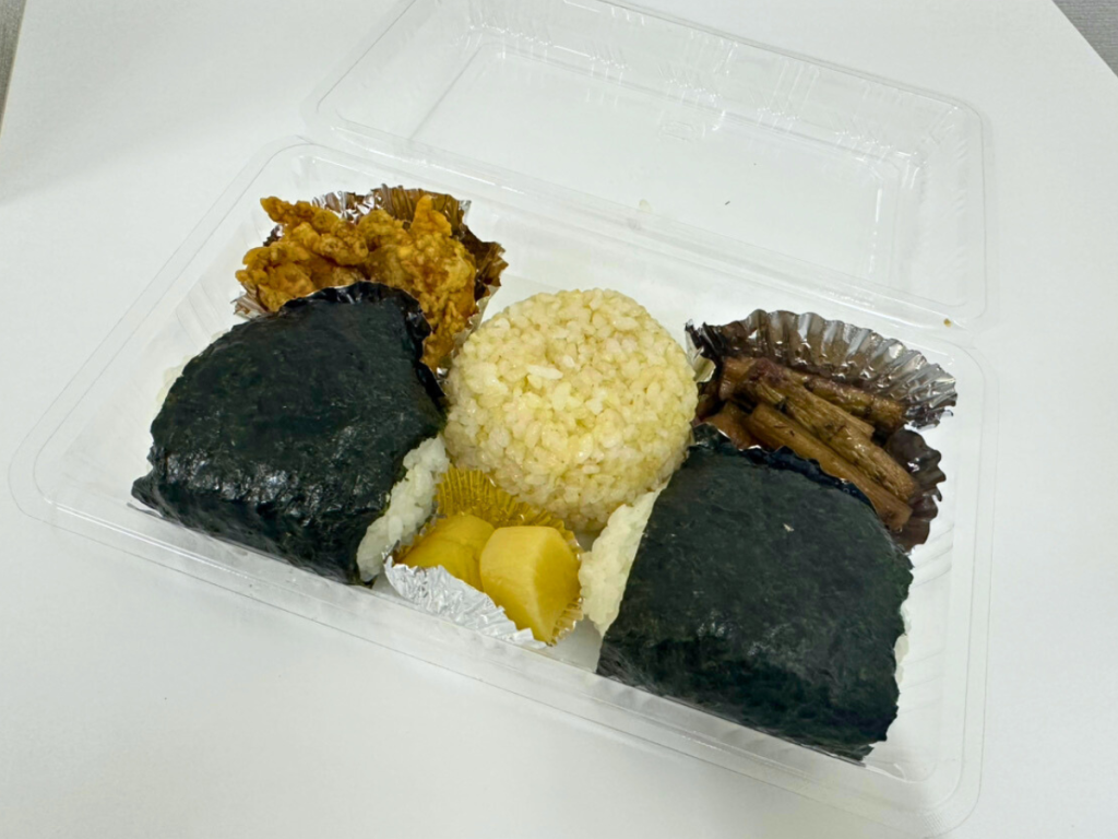 おかずに入っている たくあん・からあげ・きんぴら はバランスがよく、おむすびと一緒に食べることで、より満足感のある食事になります。