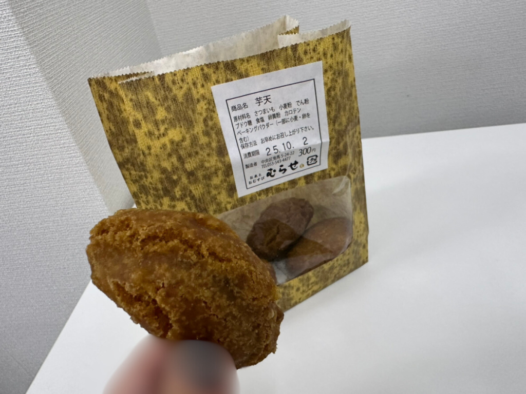 おすすめの 芋天 も購入しました。中には甘めのサツマイモがゴロっと入っており、外側は時間がたってもカリッとした食感が楽しめます。1つ1つが大きめなので、腹持ちも良く、おかずにもおやつにもなる一品です。