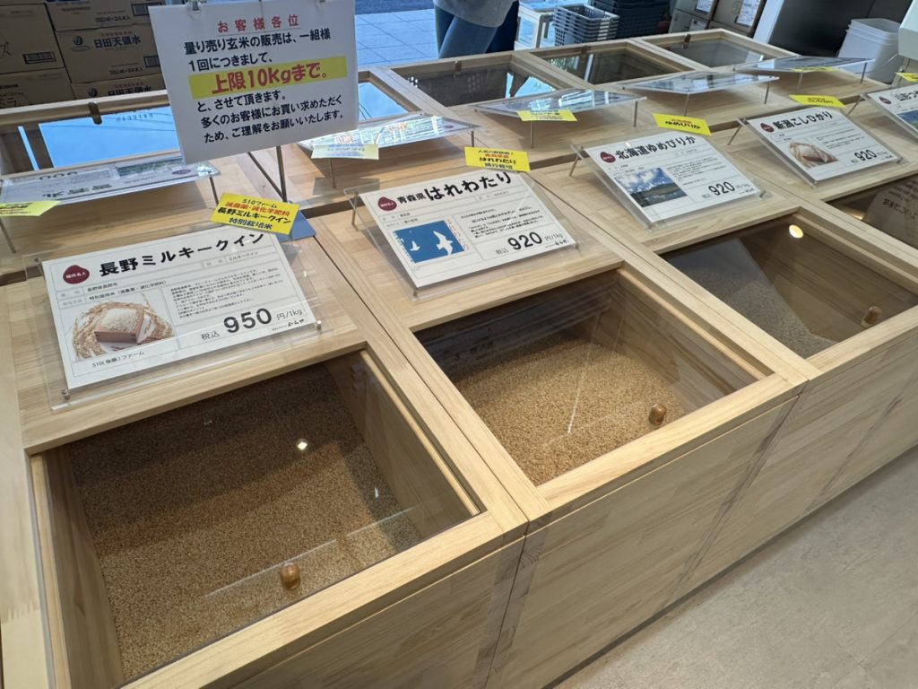 店内は清潔感あふれる明るい雰囲気で、多種多様なお米がそろっています。お米屋さんならではの豊富な種類が魅力です。さらに、ミネラルウォーターや調味料なども多く取り揃えられており、毎日の食卓に役立つ商品が揃っています。