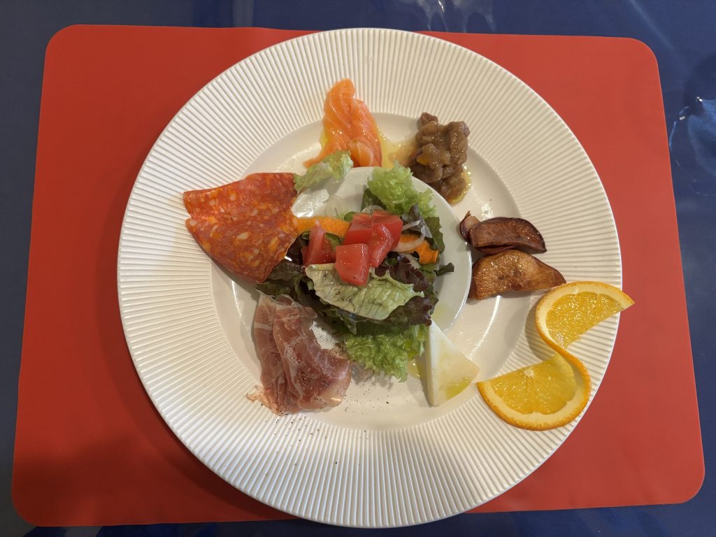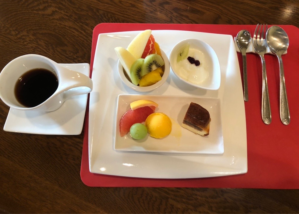 - フレッシュフルーツの盛り合わせ: キウイ、リンゴ(または洋梨)、グレープフルーツなどが、たっぷりの量で提供されています。みずみずしい酸味と甘みが、お口をリフレッシュしてくれます。