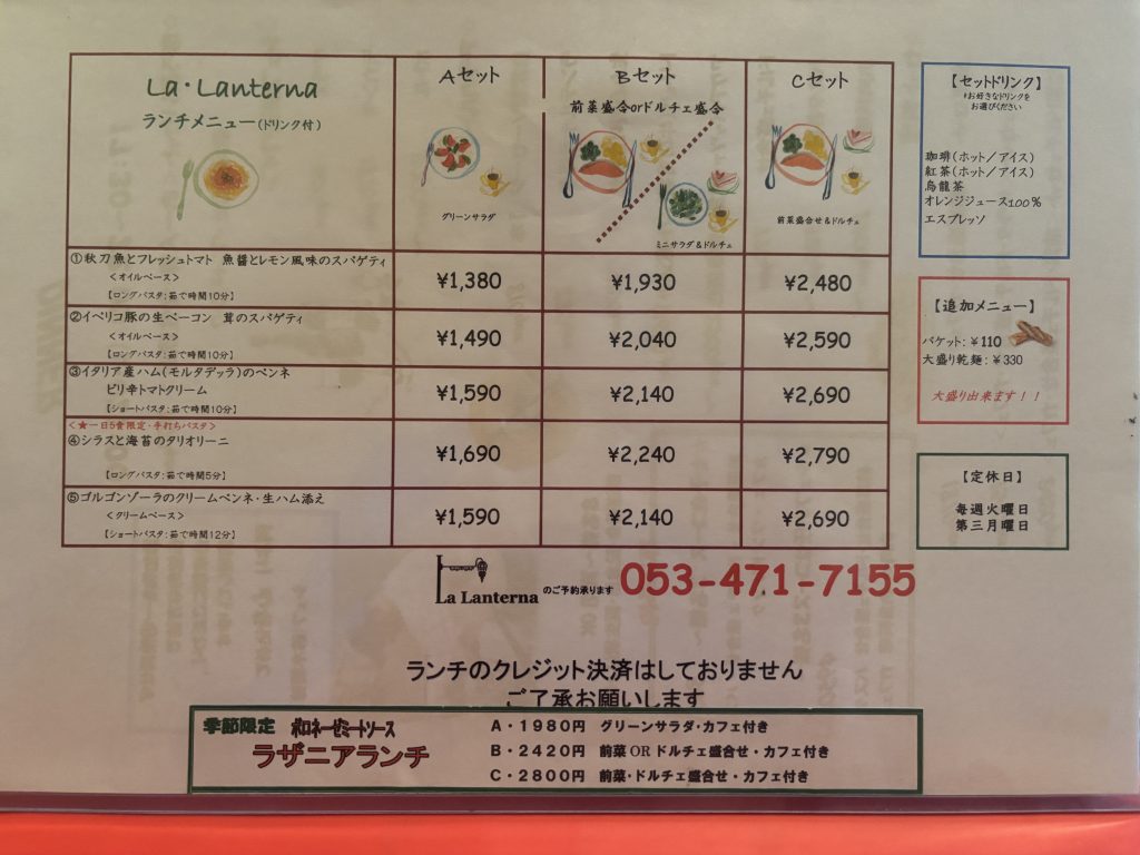 浜松市中央区下池川町にある「ランテルナ」の『ランチメニュー(ドリンク付)』です。