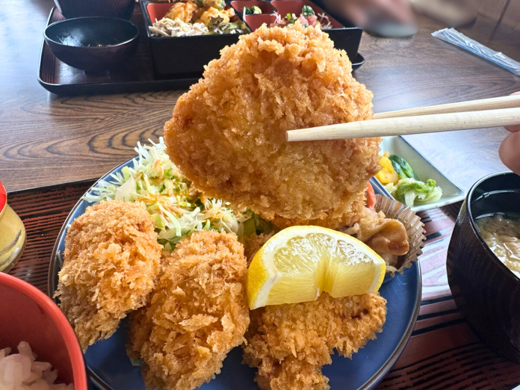 鶏かつランチには、ゴロッと大きな鶏カツが5個も付いてきます。大きさはまるで大福のようなボリューム感。付け合わせには、サラダや漬物に加えて、ポテトサラダや煮物も用意されていました。お味噌汁には豆腐やわかめのほか、天かすや車麩も入っており、具だくさんで飽きることなく最後まで楽しめます。