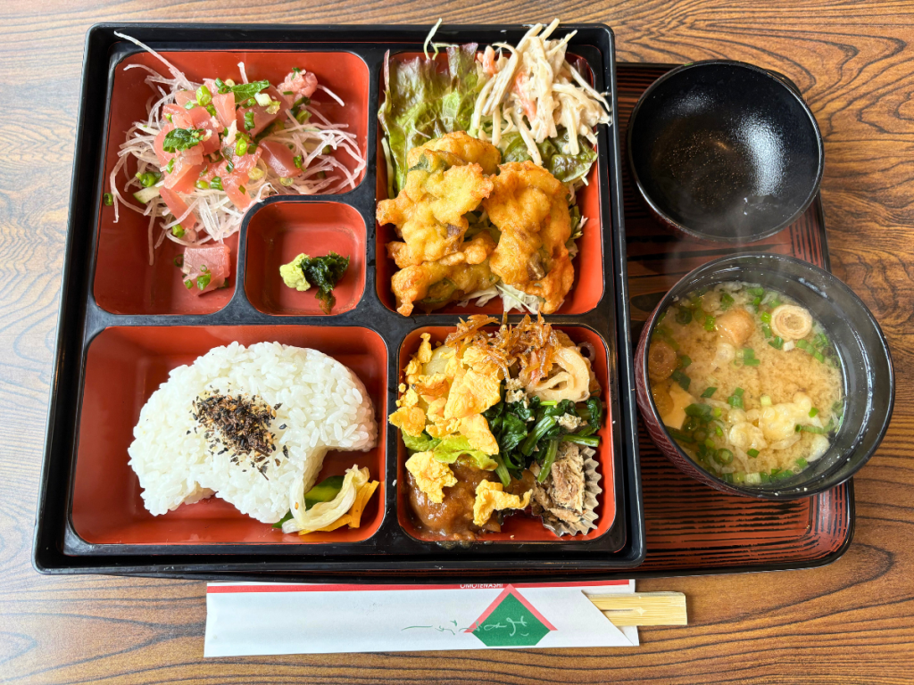 お弁当の中身は日によって変わります。店頭には、一口入ってすぐに今日のお弁当と見本が置かれていますので、ぜひご確認ください。お弁当には、お刺身、オクラとお魚の揚げ物、ごぼうサラダ、ミートボールなど、豊富なおかずが詰められています。ご飯も形が凝っていて、お店のこだわりを感じます。伺った際には、いらっしゃった女性の方々は全員こちらのお弁当を召し上がっていました。