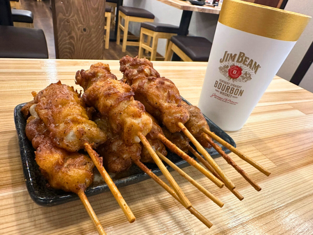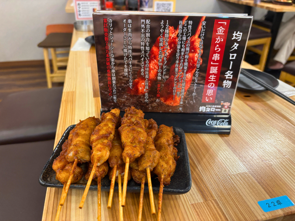 12種類のスパイスに漬け込んだ「金から串」は、一口食べるとスパイスの香りがふわっと広がります。しっとり柔らかい鶏肉にスパイスの風味がしっかり絡んでいるため、お酒との相性も抜群です。食べ始めるとついついもう一本と手が伸びてしまう、まさにやみつきになる一品です。