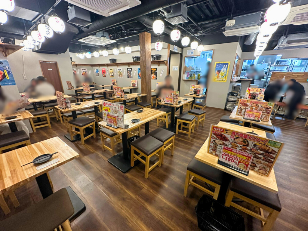 建物の3階まで上がり、通路の奥へ進むと、黄色に輝く看板が目に入ります。扉を開けると、提灯に照らされた明るい店内が出迎えてくれます。店内には2名用のテーブルから4名用のテーブルまで揃っており、少人数から大人数まで気軽に利用できます。