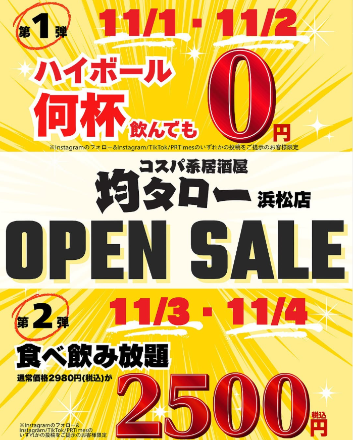 「均タロー浜松店」さんではグランドオープンに伴って11月1日~2日に第一弾。11月3日~4日にで第二弾のOPENSALEを開催します。