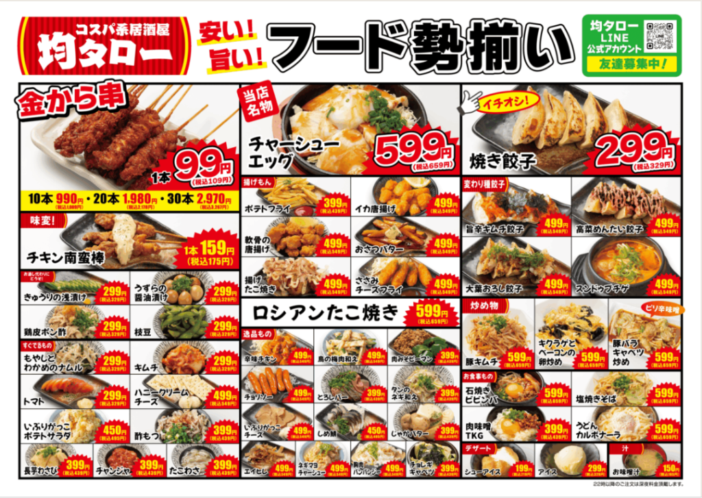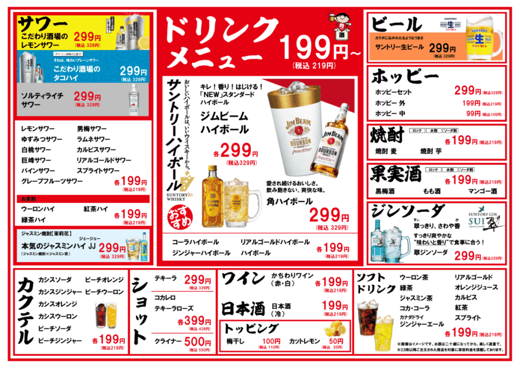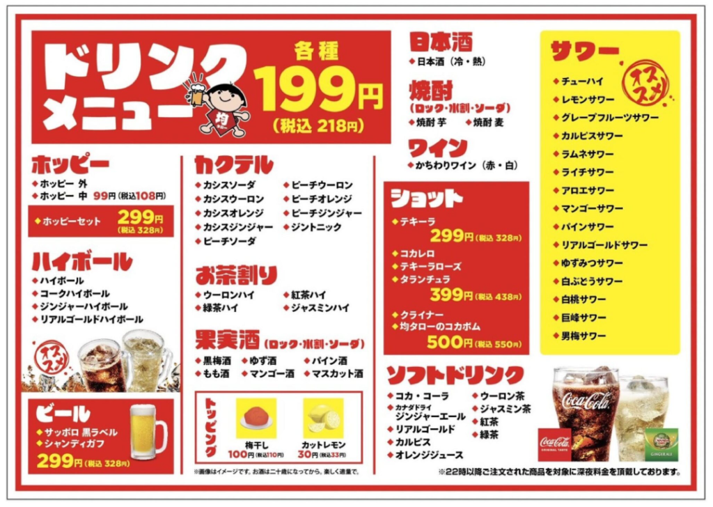 コスパ系居酒屋というだけあって、フードは99円~、飲み物も199円~ととにかくお手頃価格。