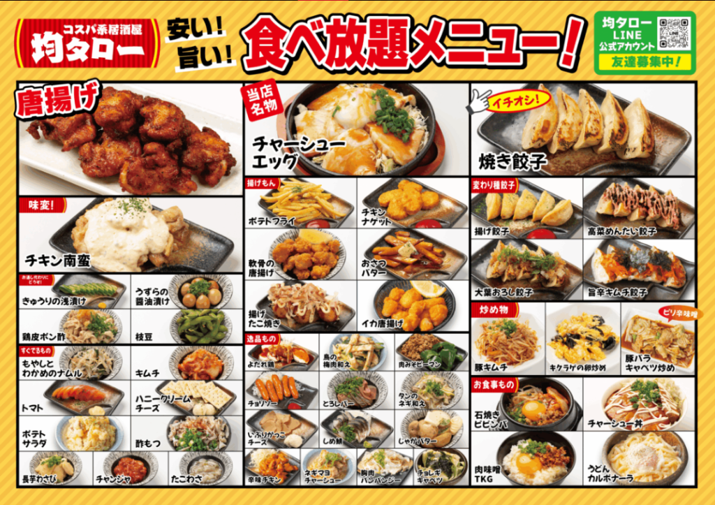 安くて美味しいだけでなく、心ゆくまで食べ飲みできる『食べ飲み放題』は、均タローならではのお得感満載のサービスです。