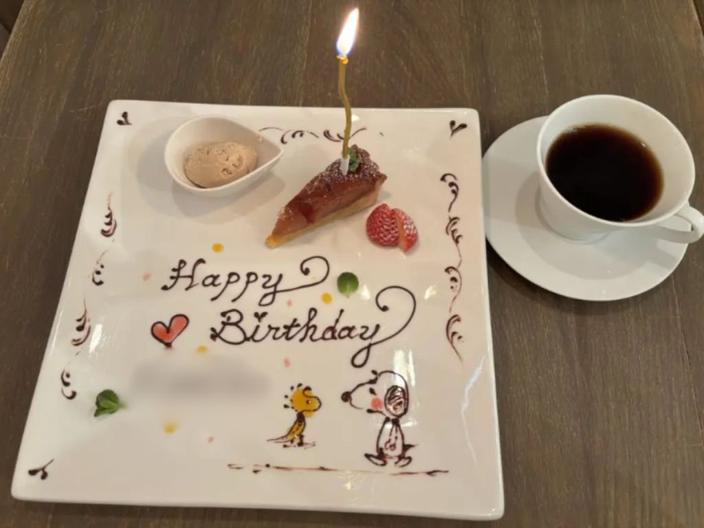 - メッセージプレートのサービス: 前日までに予約をすると、コースのデザートをメッセージ付きのデコレーションプレートに変更してくれます!