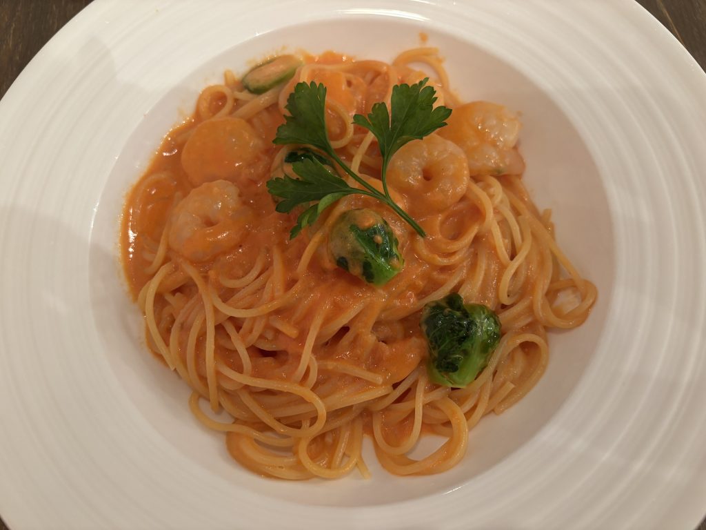 海老のトマトクリームソースには芽キャベツと海老がたっぷり入っていて相性が抜群。