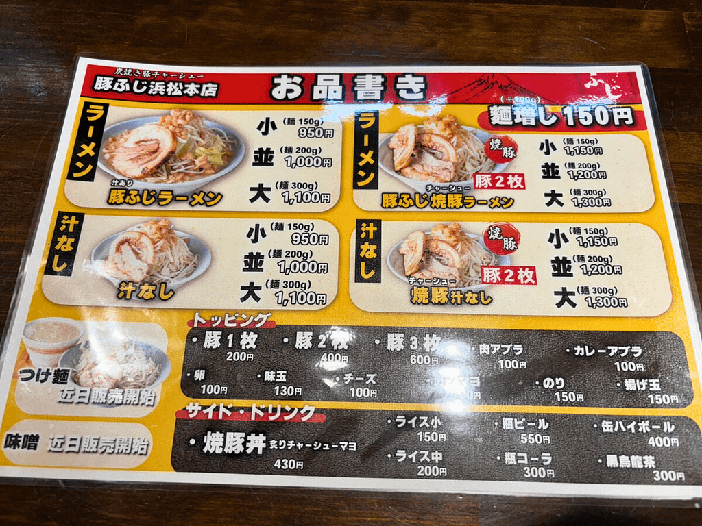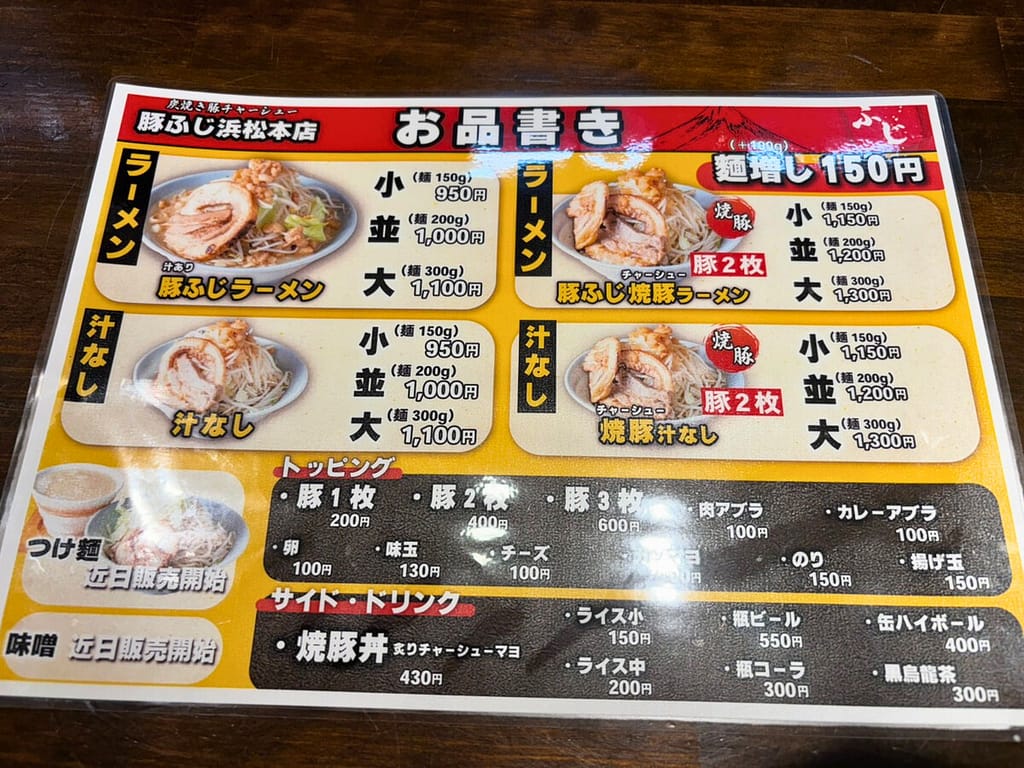 メニューは、基本の「汁あり豚ふじラーメン」のほか、焼豚が2枚のった「豚ふじ焼豚ラーメン」を用意。さらに、それぞれに汁なしバージョンもあります。