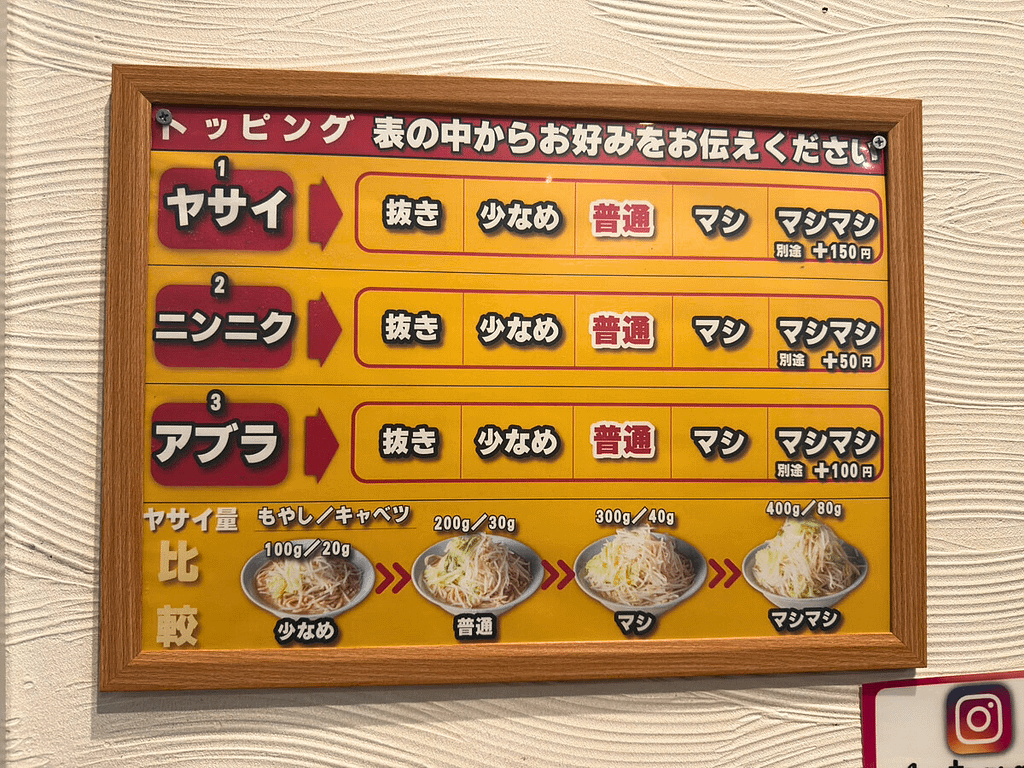 トッピングは、野菜から順に量を伝えればよく、野菜の量が分かる写真も用意されているため、注文方法が分かりやすいのが特徴。二郎系初心者にもやさしいお店です。