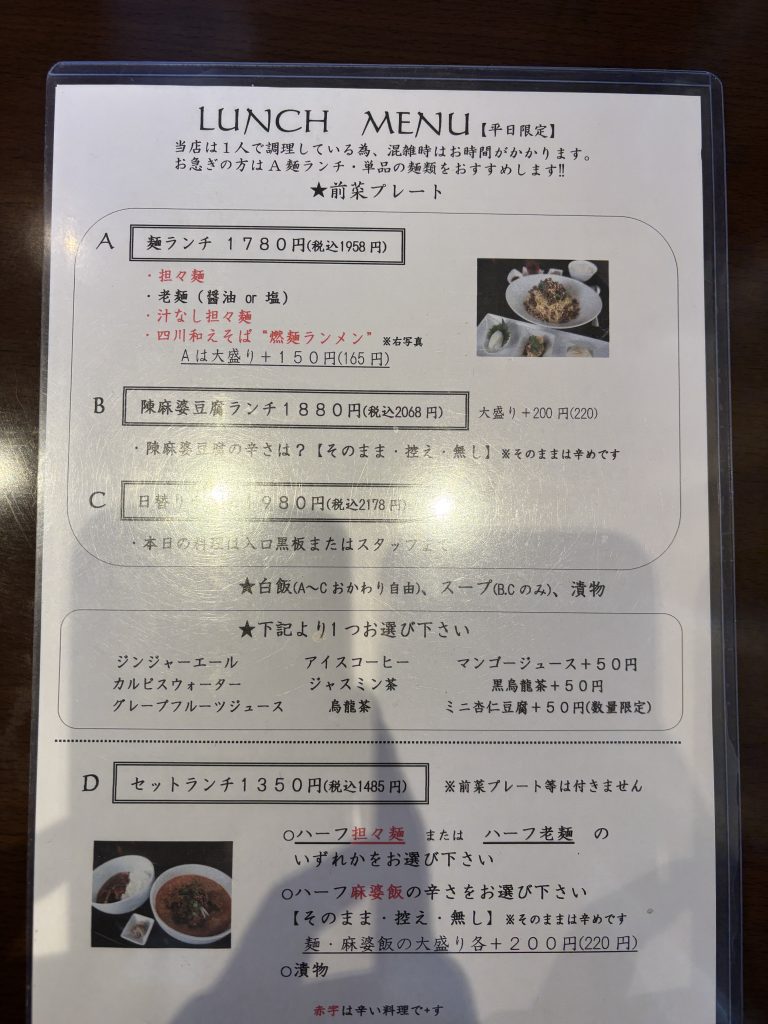 「四川飯荘 尾林」のランチは平日限定。メニューには「当店は1人で調理している為、混雑時はお時間がかかります」との一文があり、一皿一皿に込めるシェフのこだわりが伝わってきます。時間に余裕を持って訪れ、じっくりと本格四川料理を堪能するのがおすすめです。ランチは大きく分けて、豪華な前菜プレートが付くA・B・Cランチと、人気メニューを組み合わせたDセットランチの4種類が用意されています。