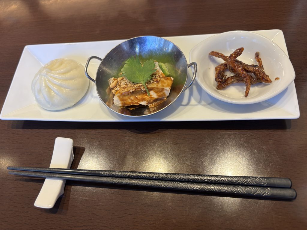 運ばれてきたのは、見た目にも美しい3種の前菜。ふっくらとしたミニ肉まん、香ばしいナッツとソースがかかった鶏肉料理(よだれ鶏風)、そしてカリカリとした食感が楽しい小魚の甘辛い一品。どれも丁寧に作られており、メインディッシュへの期待がぐっと高まります。これだけでも、お店の実力が伝わってくるようでした。