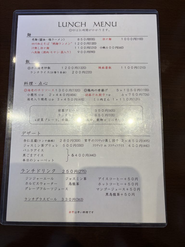 メニューの赤字が「辛い料理」の印。辛いもの好きにはたまらない「担々麺」(1,100円税込)や、汁なしタイプの「四川和えそば“燃麺”」(1,320円税込)、そして王道の「陳麻婆飯」(1,210円税込)などが揃います。
