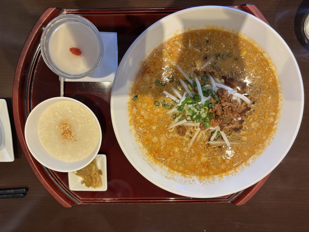 セットには、優しい味わいのお粥と漬物が付いており、担々麺との相性も抜群です。