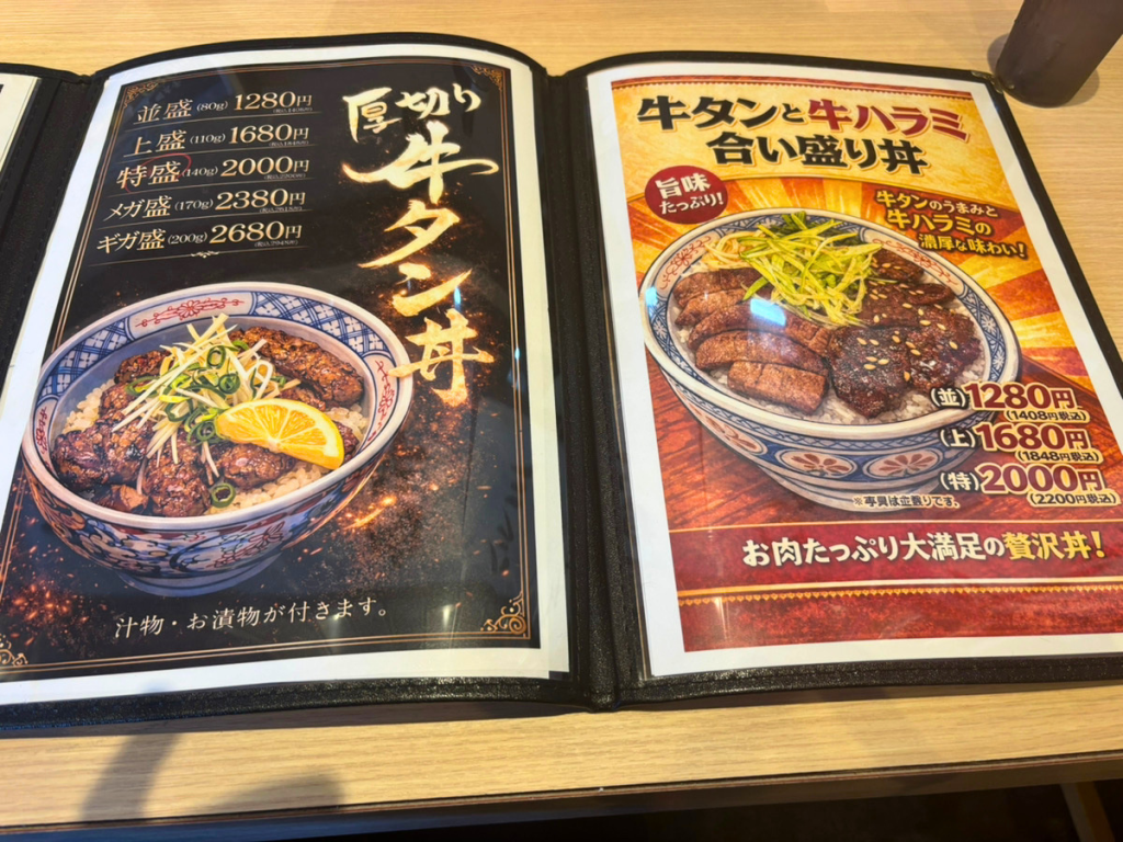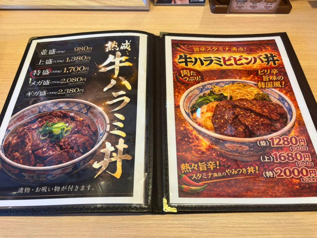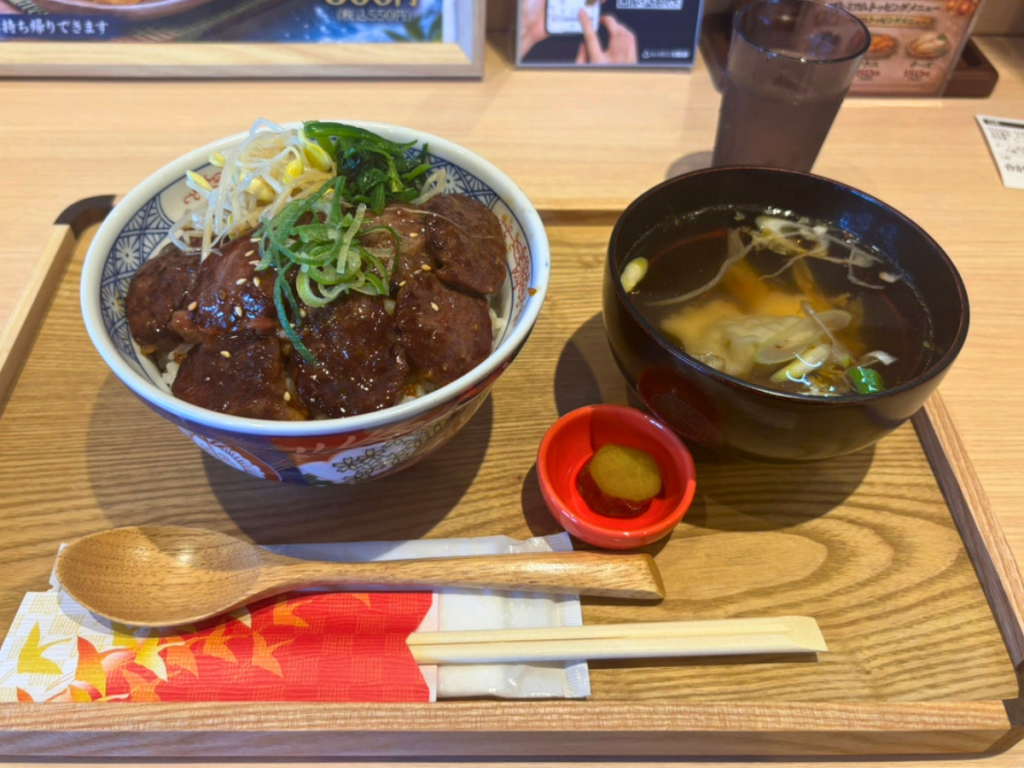 お肉好きにはたまらない丼メニューが揃っています。熟成牛ハラミ丼や厚切り牛タン丼などがあり、それぞれしっかりとした旨みと食べ応えを楽しむことができます。丼には汁物とお漬物が付いてくるのも嬉しいポイントです。