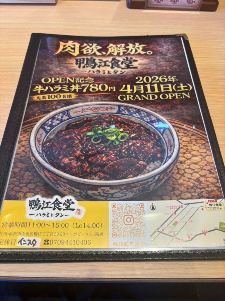 2026年4月11日、浜松市中央区鴨江に「鴨江食堂-ハラミとタン-」がオープンしました。熟成牛ハラミと厚切り牛タンをメインに楽しめるお店で、しっかりとした旨みのあるお肉を味わえるのが魅力です。また、人気店「うなぎのだいだら」の系列店としても注目を集めています。