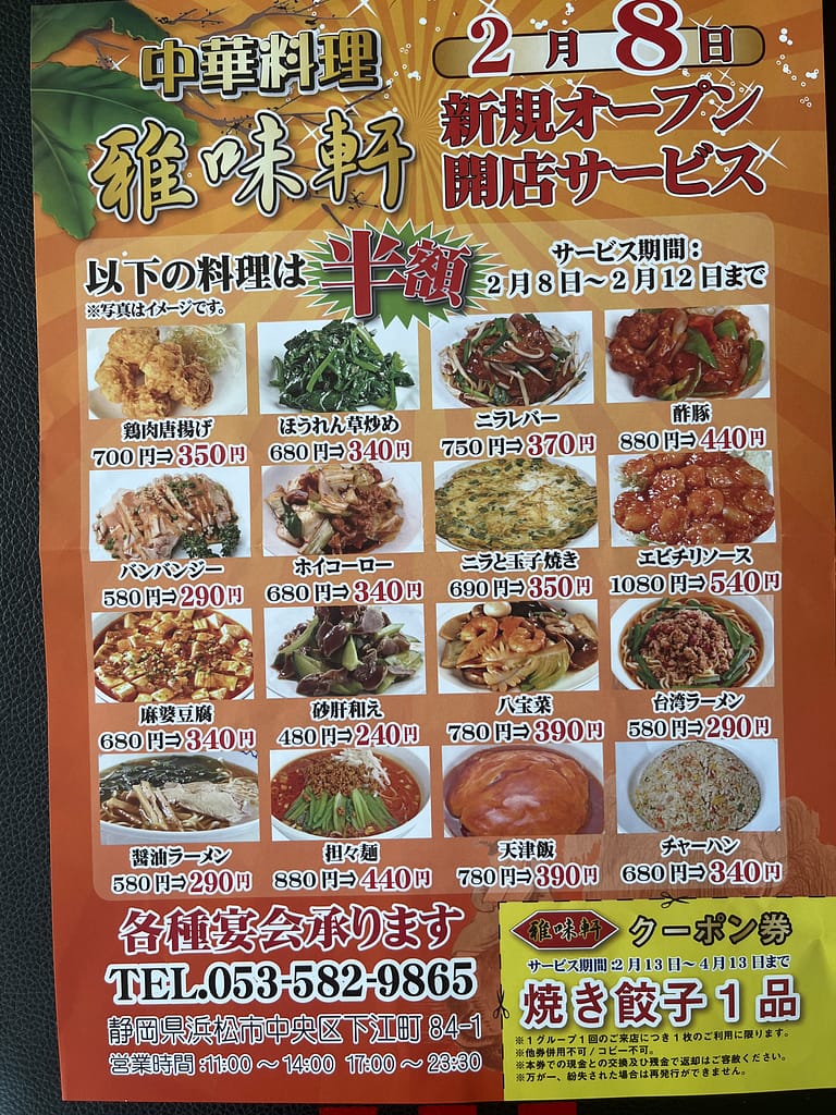 浜松市中央区下江町に『中華料理 雅味軒』が2026年2月8日にオープンしていました!