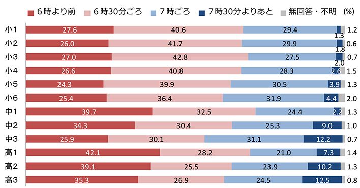 起床時刻は学年による変化が小さく、多くの子どもたちが6時半か7時ごろに起きています。