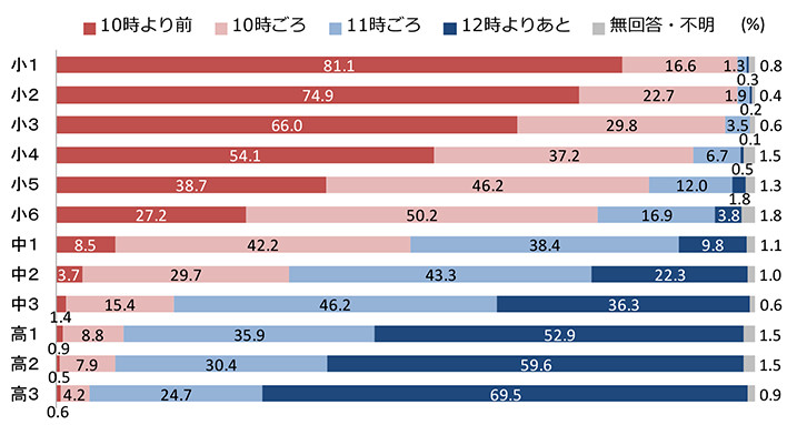 起床時刻と違って、就寝時刻は学年によって大きく異なります。