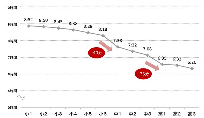 さらに、睡眠時間がどこで短くなるかに注目すると、減少幅が大きいのは小6から中1にかけてと、中3から高1にかけて。