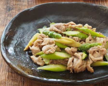 【具材】豚肉こまぎれ肉・アスパラガス・酒小さじ2・片栗粉小さじ1・塩少々・なたね油適量・しょうゆ小さじ1・みりん大さじ1・ショウガ適量