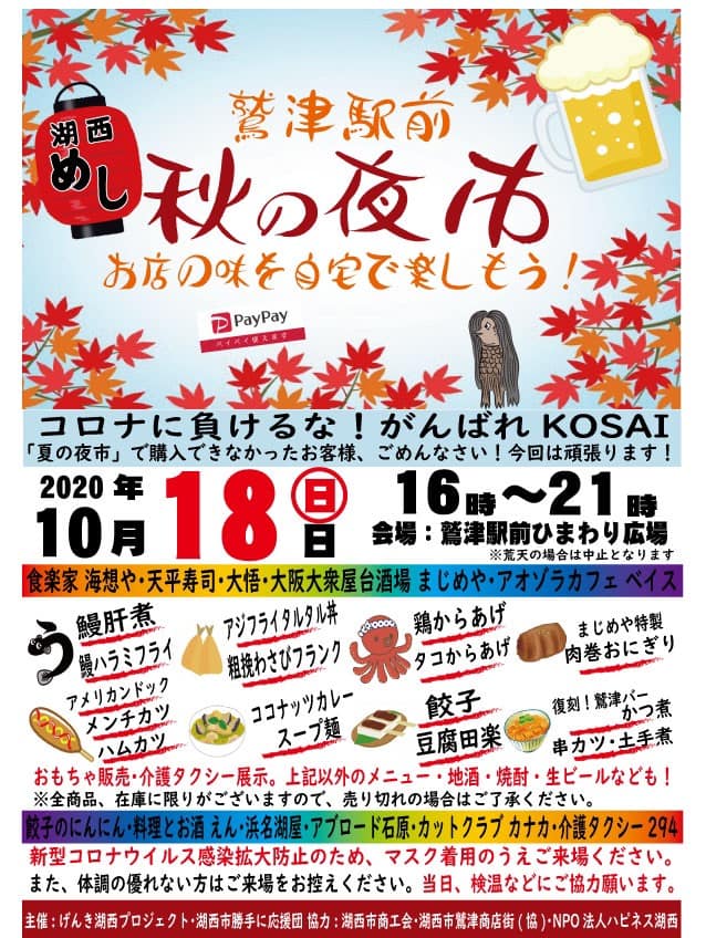 10/18鷲津駅前 秋の夜市開催されます♪ 2020年10月7日 2025年1月24日 静岡県内お楽しみ情報こんにちわ。8月に湖西市で開催されました夏の夜市の盛況に引き続き、秋の夜市が開催されることが決まりました10月18日日曜日の16時から21時までなので予定が決まってない方いらっしゃったら行かれてはどうでしょうか?私的にはウナギのハラミフライとアジフライのタルタル丼、肉巻きオニギリとカツ煮、どれも気になります♪