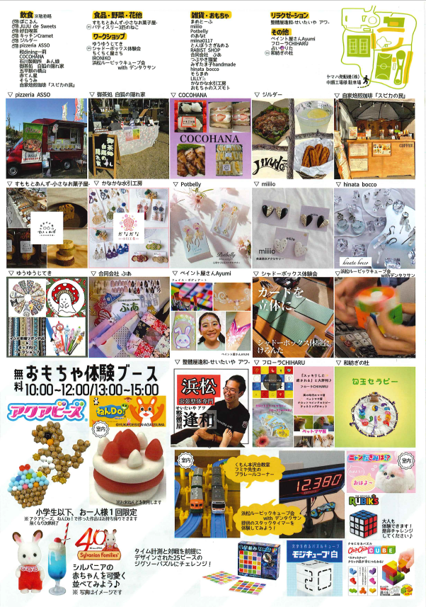 会場には、ピザやスイーツ、自家焙煎珈琲などの「飲食ブース」、ハンドメイドアクセサリーや雑貨が並ぶ「雑貨・おもちゃブース」、親子で楽しめる「ワークショップ」など、40店舗以上のお店が大集合!