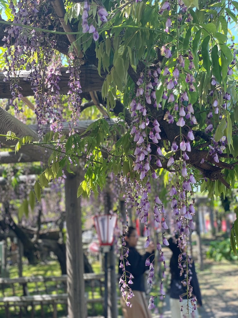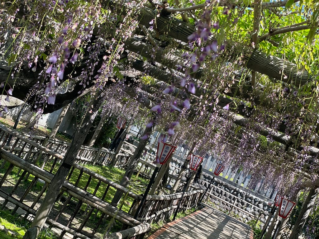 藤の花が棚いっぱいに広がる様子は幻想的で、特に晴れた日の青空とのコントラストが絶景!