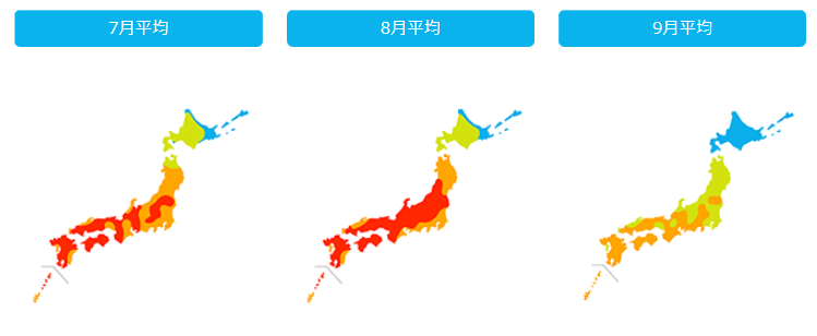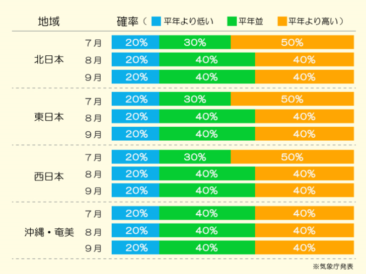 7月~9月にかけての気温は、全国的に平年並みか高くなるそうだよ。