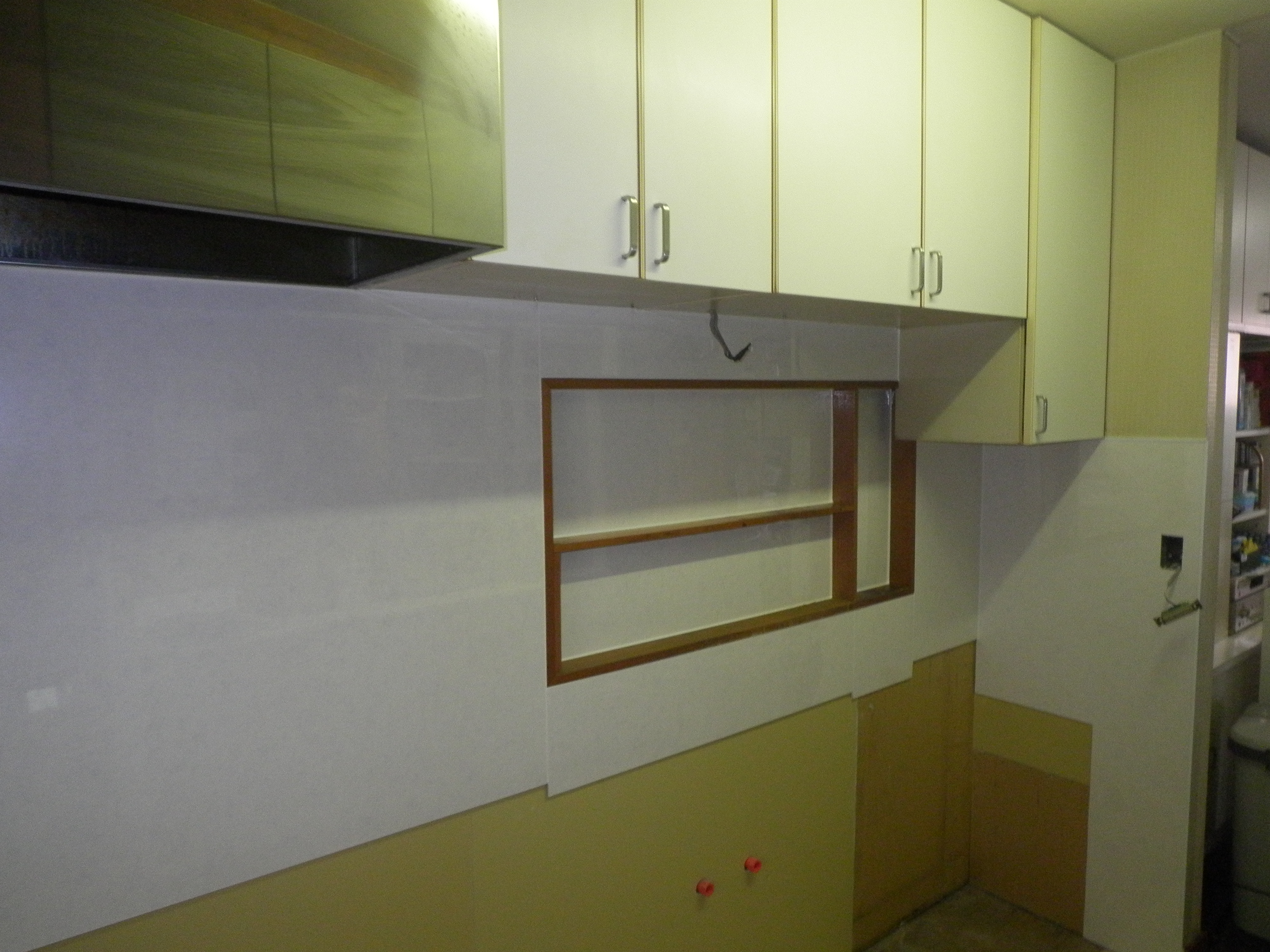 今はまだ解体をしてキッチンパネルを貼ったところだよ。