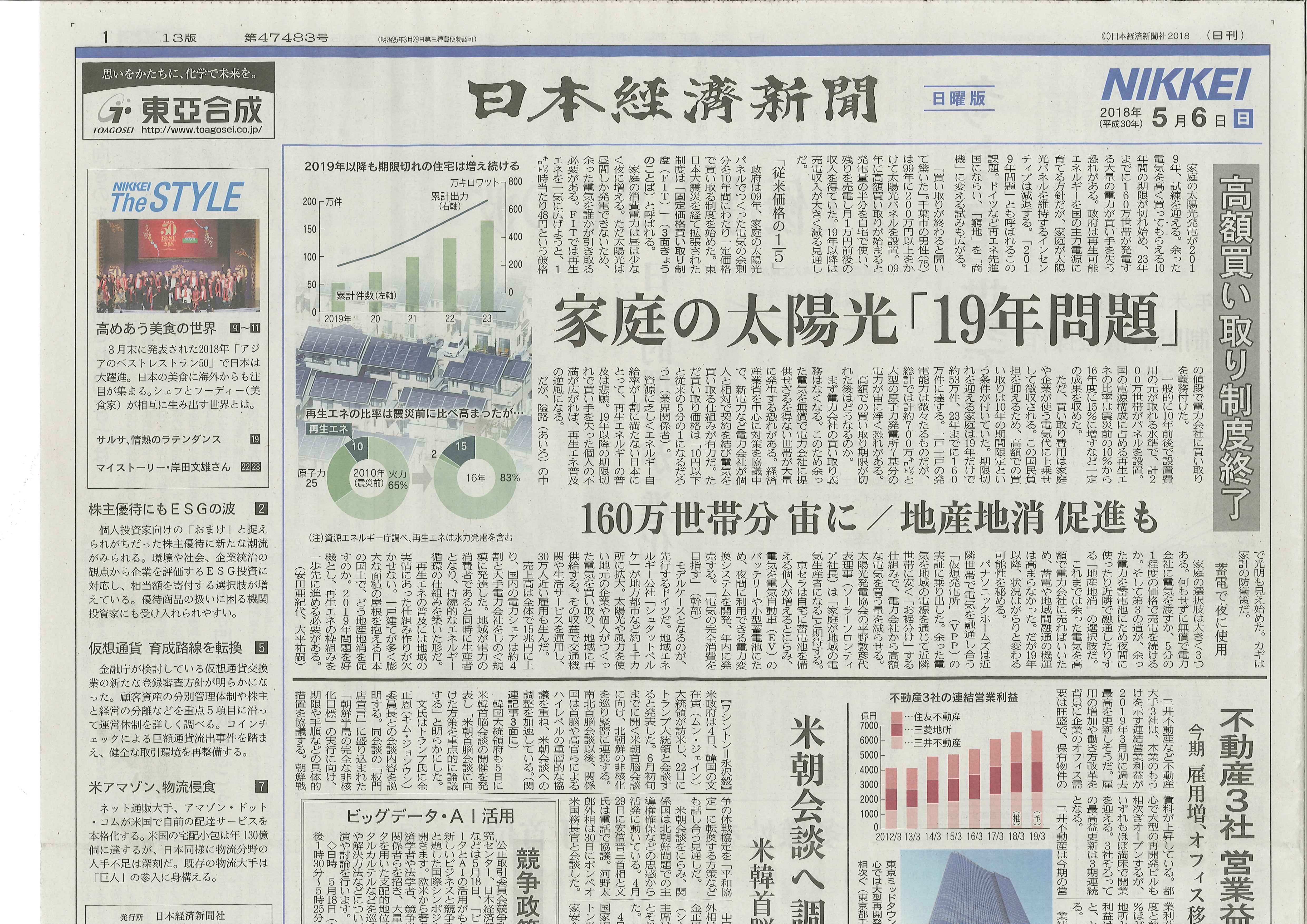 家庭用の太陽光発電の2019年問題、先月の日経一面に取り上げられていましたね。