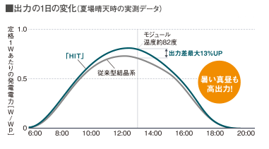 夏場の晴天時の太陽電池温度が約82度の場合、HITは従来結晶系太陽電池と比べると、出力差が最大13%アップします。暑い真昼でも高出力・高効率です。