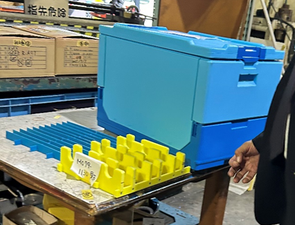 機械部品は、主にベアリング(画像左)やボールねじ、リニアガイド等の精機製品を取り扱っています。物流機器は、主にプラスチックコンテナ(画像右)やボックスパレット等の他にも、オーダーメイドの物流機器も提供可能です!